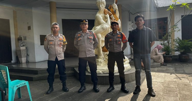 Salah satunya pengamanan yang dilakukan Personel Satuan Samapta Polres Ciamis Polda Jabar saat pelaksanaan Kebaktian Minggu Pagi di sekitar Gereja Kristen Indonesia Ciamis. Personel bersiaga di sekitar Gereja Katolik Santo Yohanes Pembantis, Ciamis, Kabupaten Ciamis, Jawa Barat, Minggu (5/10/2025).