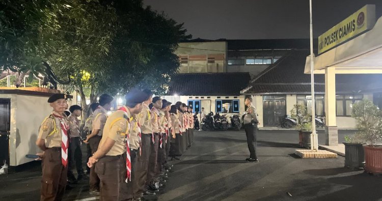 Para anggota Saka Bhayangkara, baik tingkat Polres Ciamis maupun Ranting atau Polsek turun membantu pelaksanaan pengamanan Natal dan Tahun Baru 2026 di setiap Pos Ops Lilin Lodaya 2025. Salah satunya mereka yang bertugas di Pos Pengamanan Terpadu Ops Lilin Lodaya 2025 Polres Ciamis, Alun Alun Ciamis, Ciamis, Kabupaten Ciamis, Jawa Barat, Rabu, 31 Desember 2025, malam hingga dini hari.