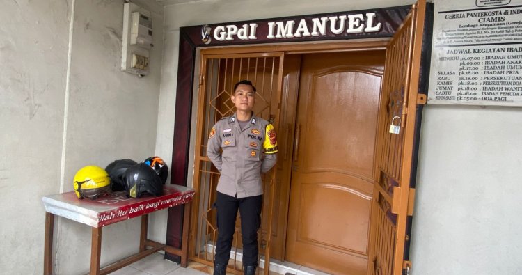 CIAMIS ~ Personel Polres Ciamis bersiaga melaksanakan pengamanan kegiatan keagamaan umat kristiani/nasrani di kawasan pusat kota Kabupaten Ciamis. Pengamanan ini salah satunya dilakukan pada Gereja Pantekosta di Indonesia (GPdI) Immanuel Ciamis, Jalan Ir. H. Juanda No. 231, Kelurahan Ciamis, Kecamatan Ciamis, Kabupaten Ciamis, Jawa Barat, Minggu (5/10/2025).