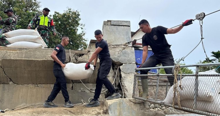 Bireun - Personel SAR Satuan Brimob Polda Aceh membantu menyalurkan bantuan logistik untuk masyarakat terdampak bencana di Desa Kubu, Bireuen, dengan menggunakan jembatan Sling Baja.