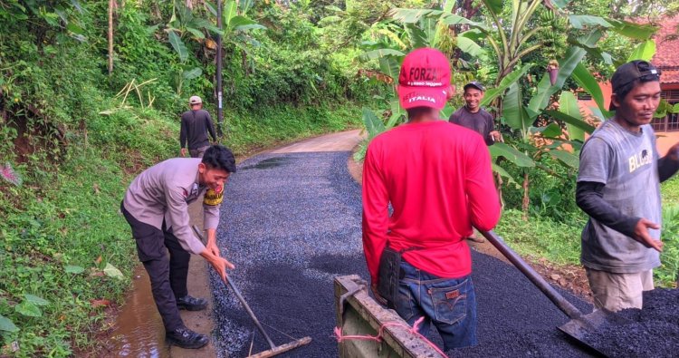 CIAMIS ~ Personel Polsek Cikoneng Polres Ciamis Polda Jabar melaksanakan humanis dengan mendatangi dan ikut membantu kegiatan masyarakat berupa pembangunan jalan menggunakan hotmik di Desa Cimari. Pembangunan jalan ini berada di Dusun Jalatrang, Desa Cimari, Kecamatan Cikoneng, Kabupaten Ciamis, Jawa Barat, Selasa (2/12/2025).