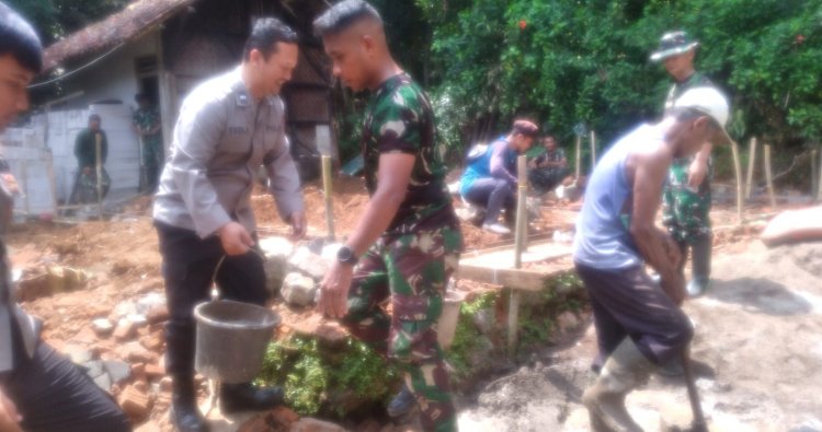 CIAMIS ~ Personel Polsek Lakbok Polres Ciamis Polda Jabar melaksanakan kegiatan humanis dengan hadir bergotong royong bersama TNI dan warga percepatan pembangunan di Desa Sukamulya. Salah satunya dengan ikut serta di dalam program TNI AD Manunggal Membangun Desa (TMMD) Kodim 0613/Ciamis di Desa Sukamulya, Kecamatan Purwadadi, Kabupaten Ciamis, Jawa Barat, Minggu (12/10/2025).