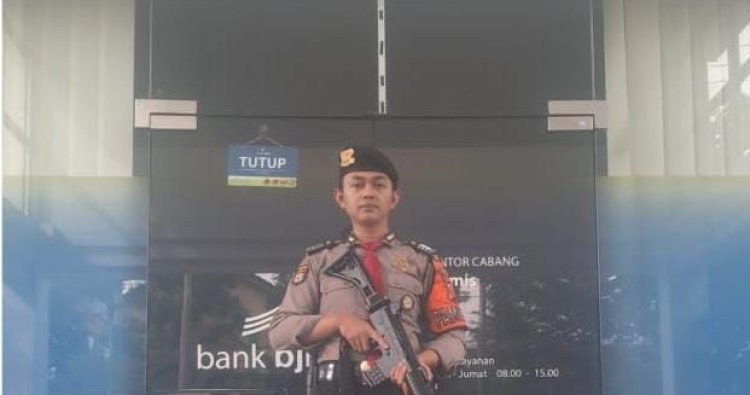 Seperti yang dilaksanakan oleh Personel Unit Pam Obvit yang disiagakan untuk membantu sekaligus penebalan pengamanan di area perbankan. Salah satunya anggota bersiaga di area Bank BJB Cabang Ciamis, Ciamis, Kabupaten Ciamis, Jawa Barat, Sabtu (13/12/2025).