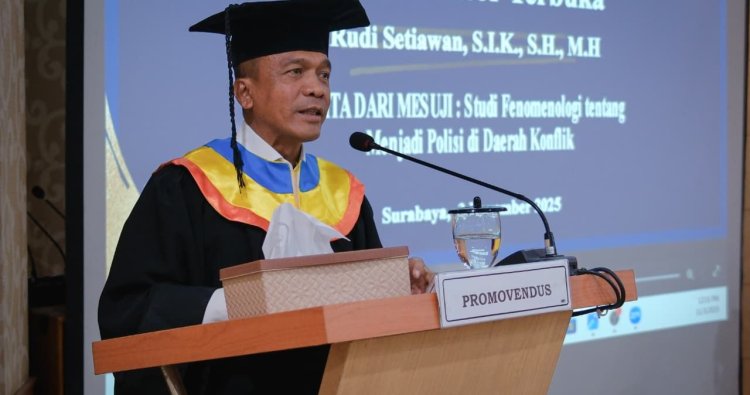 Kapolda Jabar, Irjen Rudi Setiawan menjalani sidang disertasi berjudul 'Cerita dari Mesuji: Studi Fenomeno logi tentang Menjadi Polisi di Daerah Konflik' di Universitas Airlangga, Senin (3/11/2025). Irjen Rudi Setiawan dengan penuh percaya diri di hadapan para penguji yang hadir demi menyabet gelar doktor memaparkan tentang menjadi polisi yang profesional, bertanggung jawab, dan berintegritas di wilayah yang penuh masalah, kekerasan masyarakatnya meluas dan melembaga, hingga keberadaan polisi tak pernah diterima sepenuhnya.