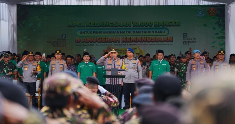Cirebon - Kepala Kepolisian Negara Republik Indonesia (Kapolri) Jenderal Polisi Listyo Sigit Prabowo memimpin langsung Apel Kebangsaan Banser untuk Pengamanan Hari Raya Natal 2025 dan Tahun Baru 2026 yang dirangkaikan dengan Penganugerahan Kemanusiaan Riyanto Award 2025, Selasa (23/12/2025). Kegiatan tersebut dilaksanakan di Halaman Masjid Syarif Abdurachman, Cirebon, Jawa Barat.