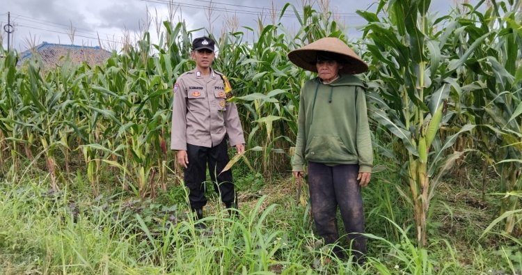 Tampak hadir Bripka Hendi Suharyadi mewakili Kapolsek Cikoneng Kompol Husen Sujana melakukan tanam jagung bersama Kelompok Tani Sriwaringin 1 dalam upaya menjaga ketahanan pangan nasional.
