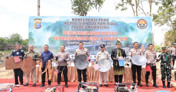 Kuantan Singingi-Wakapolda Riau Brigjen Hengki Haryadi memimpin langsung jumpa pers pengungkapan kasus Pertambangan Emas Tanpa Izin (PETI) di wilayah hukum Polres Kuantan Singingi, Kamis (23/4/2026).