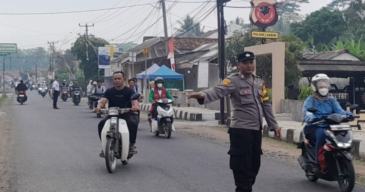 Tampak terlihat Brigadir Diko Pudjoko anggota Polsek Lakbok Polres Ciamis Polda Jabar memberikan pelayanan masyarakat di pagi hari. Anggota hadir untuk melakukan pengaturan lalu lintas dan membantu warga menyebrang.