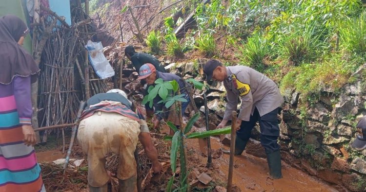 Selain melakukan peninjauan dan pendataan, aparat kepolisian juga membantu warga setempat membersihkan sisa material tanah yang menumpuk di sekitar rumah korban. Mereka bekerja bersama masyarakat dan perangkat desa agar lingkungan sekitar kembali aman untuk ditinggali. Sinergi antara Polsek Kawali, pemerintah desa, serta warga menjadi bukti nyata bahwa semangat gotong royong masih kuat terjaga di tengah tantangan bencana alam.