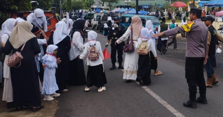 CIAMIS ~ Polsek Sukadana Polres Ciamis Polda Jabar melaksanakan pengaturan lalu lintas saat momemtum acara pengajian bulanan tingkat kecamatan. Anggota bersiaga di area Gedung Islamic Center Sukadana, Jalan raya Ciilat-Baregbeg, Kecamatan Sukadana Kabupaten Ciamis, Jawa Barat, Kamis (30/10/2025).